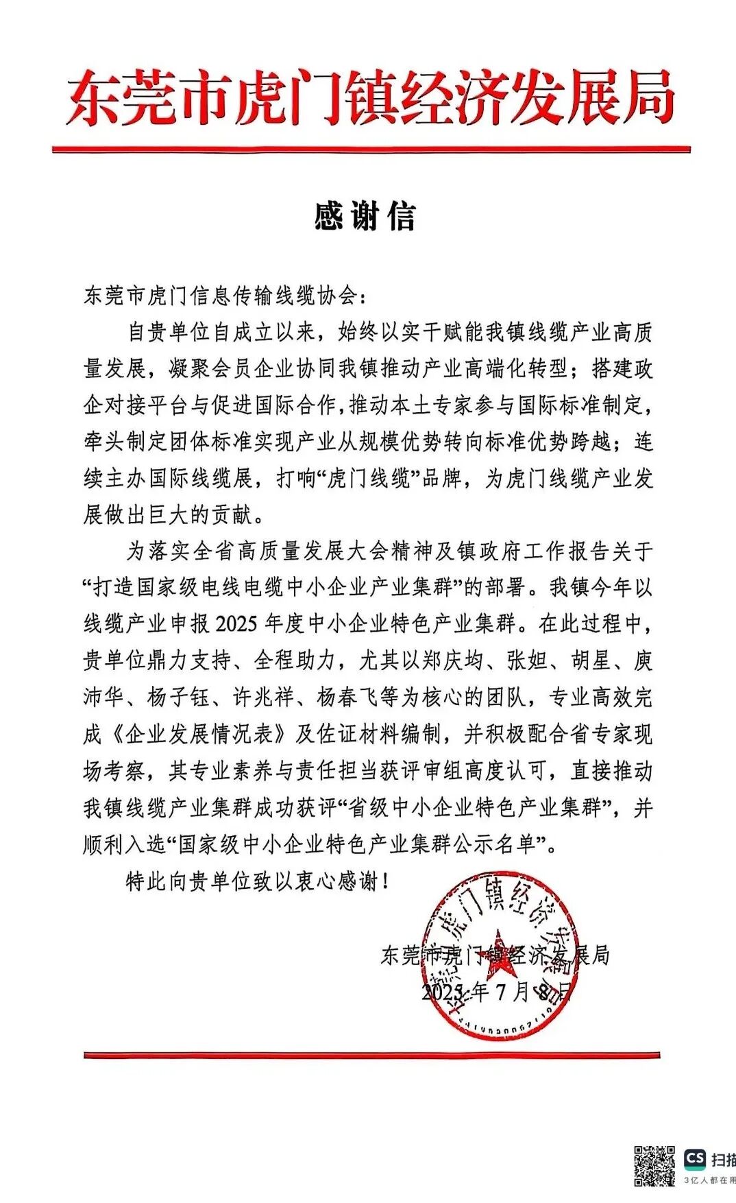 会上,首先传来振奋人心的消息——虎门线缆产业集群入选 2025年度国家级中小企业特色产业集群!这一 “国字号” 认证,不仅是对虎门线缆产业多年深耕的肯定,更标志着其在全国行业的地位与竞争力实现重大突破,正式迈入高质量发展新阶段。