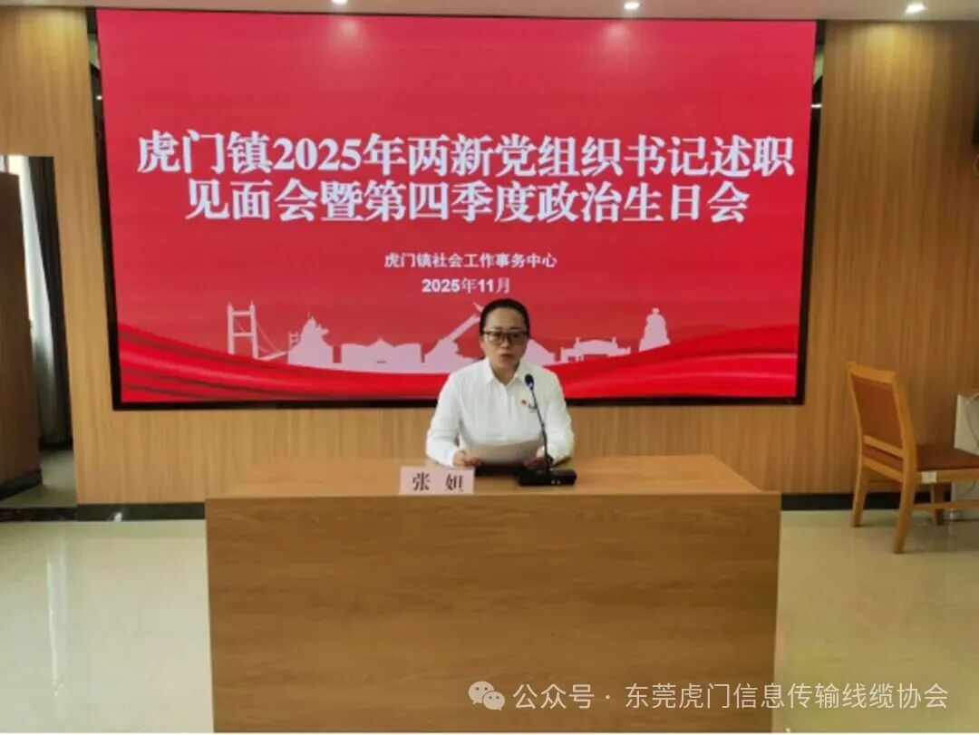 为深入学习贯彻党的二十大和二十届四中全会精神,扎实推动两新组织党建工作,引导两新组织党员不忘初心、牢记使命,为虎门高质量发展作出积极贡献,11月27号,虎门镇两新组织党委在镇委党校召开2025年两新党组织书记述职见面会暨第四季度政治生日会。虎门镇两新党组织书记和第四季度政治生日党员代表约150人参加了会议。中共东莞市虎门信息传输线缆协会支部委员会书记张妲参加并进行述职报告。