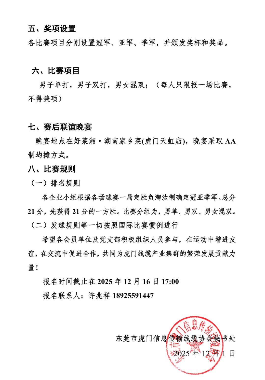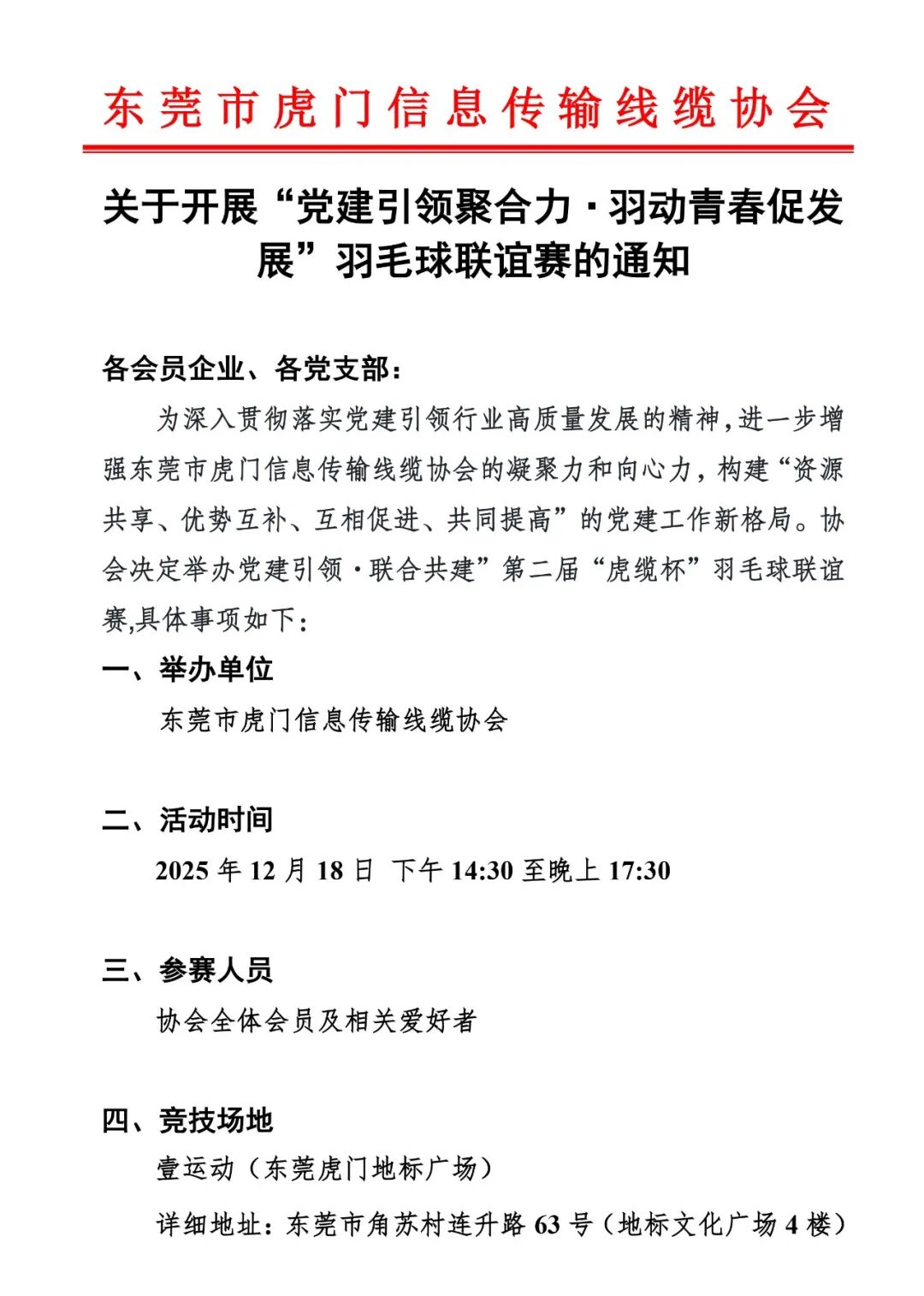 为进一步丰富协会成员的业余生活,促进会员单位之间的沟通交流,增强团队凝聚力,展现信息传输线缆行业积极向上的精神风貌,东莞市虎门信息传输线缆协会将举办第二届“虎缆杯”羽毛球联谊赛!